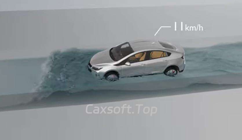 仿真车辆通过积水路段时的水花飞溅、发动机舱进水路径,以及冷却系统的热交换过程。